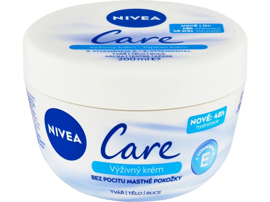 NIVEA Care krém na tvář, ruce a tělo má lehkou konzistenci, která se po nanesení rychle vstřebává a díky pečujícím složkám dodává pokožce po celý den intenzivní výživu bez pocitu mastnoty. NIVEA Care krém na tvář, ruce a tělo si vás získá svou jemnou ženskou vůní.