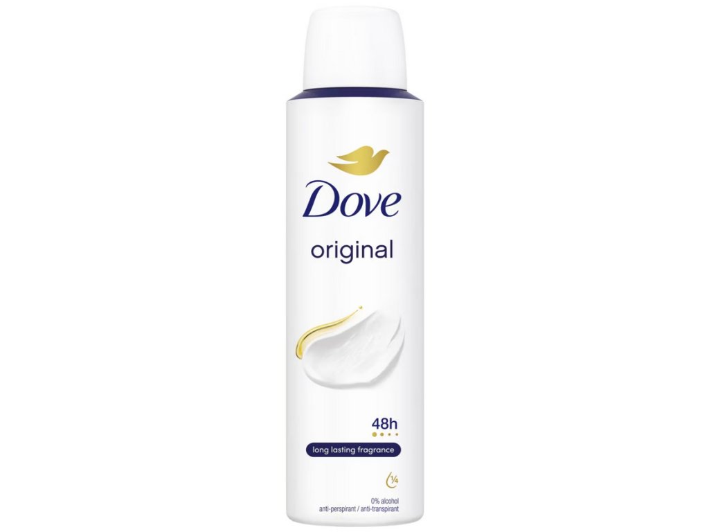 Dove antiperspirant sprej Original s ¼ hydratačního krému podporuje regeneraci pokožky po holení. Po holení pomáhá snížit podráždění citlivé pokožky v podpaží a poskytuje ochranu před pocením až po dobu 48 hodin. Zůstaňte v suchu celý den, aniž byste ohrozily hebkost svého podpaží - zvolte antiperspirant sprej Dove Original!