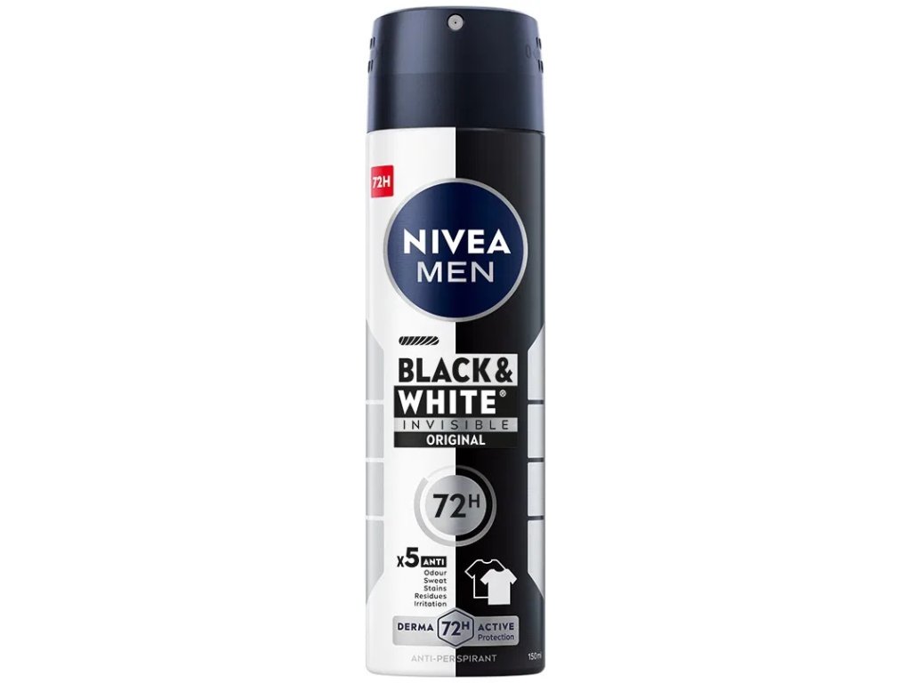 NIVEA Men Invisible for Black & White sprej antiperspirant se svěží mužnou vůní zaručuje spolehlivou ochranu proti pocení, která trvá až 48 hodin. Navíc velmi účinně působí proti vzniku žlutých skvrn od potu na bílém oblečení a bílých skvrn od antiperspirantu na černém oblečení.
