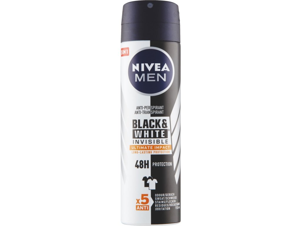 Chraňte své oblečení před vznikem bílých stop na černém oblečení a žlutých skvrn na bílém oblečení s Nivea Men antiperspirantem sprejem Black & White Invisible Ultimate Impact. Účinně chrání před pocením a nepříjemným tělesným zápachem až na 48 hodin. Nedráždí, je šetrný k pokožce podpaždí. Pro dlouhodobý pocit svěžesti je tu Nivea Men antiperspirant!