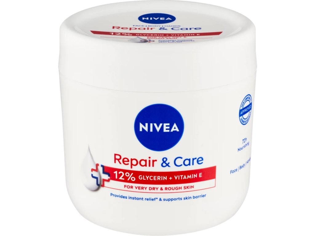 Nivea Repair & Care tělový krém je vhodný na tělo, tvář i ruce. Díky obsahu 12 % glycerinu a vitamínu E poskytuje extra péči a 72 h hydrataci. Tento krém okamžitě ulevuje velmi suché a hrubé pokožce a zároveň podporuje kožní bariéru. Přestaňte se trápit suchou pokožkou a začněte si užívat pocit úlevy a péče s tělovým krémem poskytujícím komplexní péči o vaši pokožku. S Repair&Care tělovým krémem od značky NIVEA budete mít zdravou, hydratovanou a hebkou pokožku po celý den.