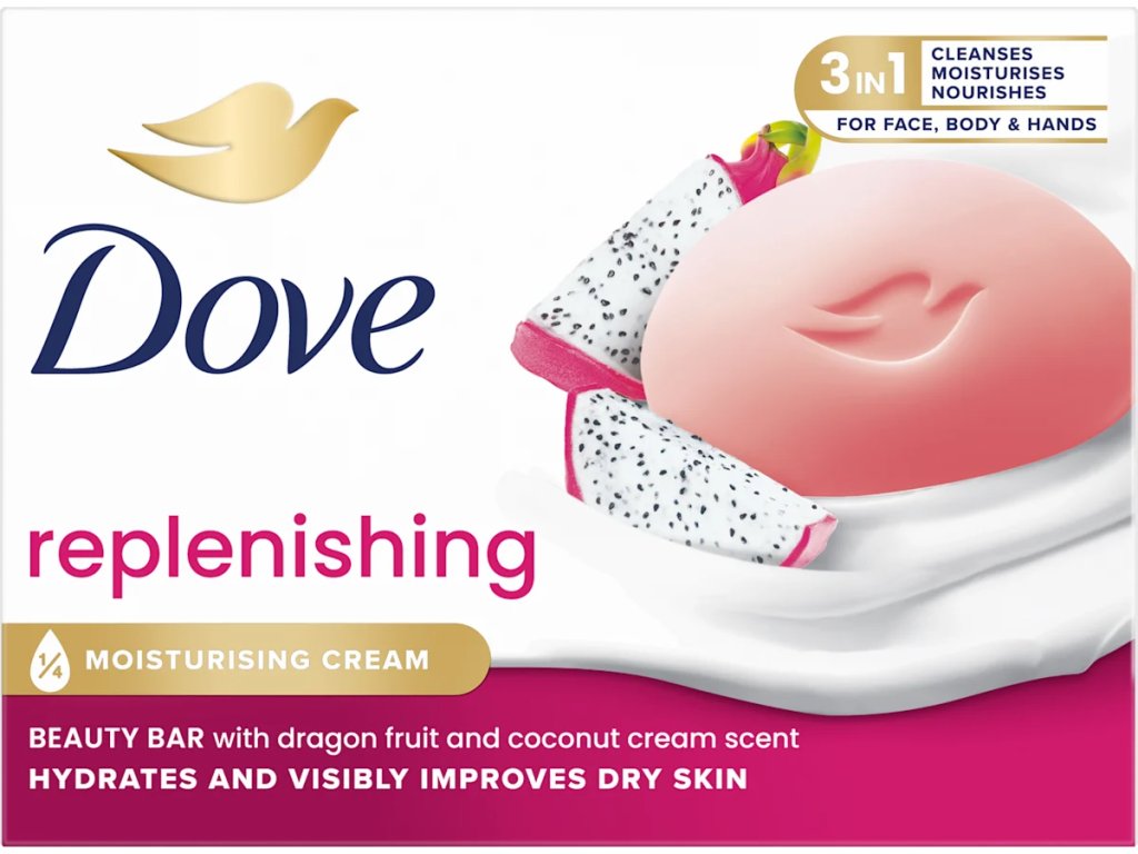 Vychutnejte si pocit hedvábně jemné a hebké pokožky s tuhým mýdlem Dove. Spojení jemných čisticích složek a ¼ hydratačního krému spolu s vůní dračího ovoce a kokosu pomáhá obnovení přirozeného lesku vaší pleti. Dove replenishing tuhé mýdlo Fruit&Coconut je nyní ještě udržitelnější spolu s čisticími složkami rostlinného původu, PETA Vegan certifikací a z 99% biologicky rozložitelným složením.