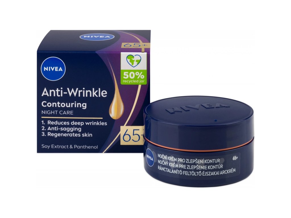 Nivea® Noční krém pro zlepšení kontur 65+ zlepšuje kontury a regeneruje zralou pleť během noci. Složení se sójovými výtažky, jojobovým olejem a panthenolem zajistí intenzivní hydrataci.