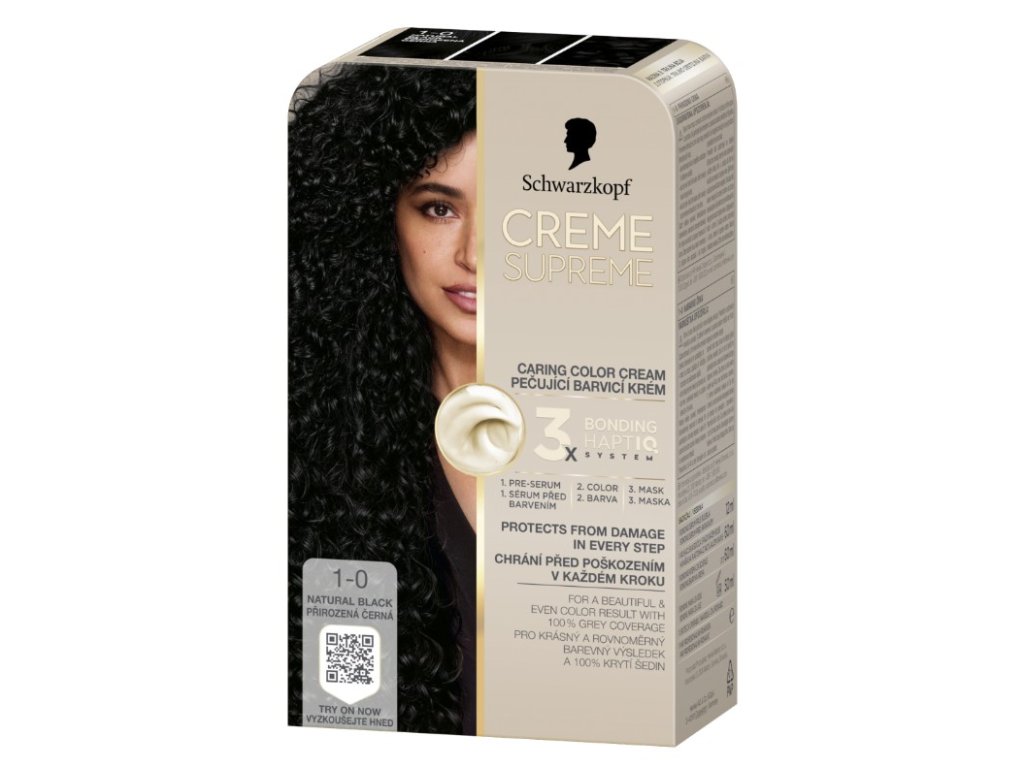 Schwarzkopf Creme Supreme - barva, kterou chcete, s péčí, kterou si zasloužíte. Tato barva na vlasy Schwarzkopf, která pečuje, obsahuje systém HaptiQ pro trojité posílení vazeb uvnitř vlasů, který vlasy připraví, chrání a posiluje pro krásnou a rovnoměrnou barvu s až 100% krytím šedin. Jak to funguje? Bonding pre-serum: Intenzivní pečující pre-serum se systémem Schwarzkopf Bonding HaptiQ dokonale připraví vlasy na barvení. Vytváří nové mikrovazby a vyhlazuje tenké oblasti, posiluje vlasy a umožňuje rovnoměrné a krásné barvení vlasů. Bonding barva na vlasy: Chrání vlasy před novým poškozením během barvení pro krásnou barvu. Bonding maska: Pokrývá vlasy ochrannou vrstvou a vytváří nové mikrovazby pro intenzivní péči o vlasy.