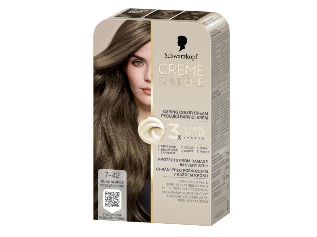 Schwarzkopf Creme Supreme - barva, kterou chcete, s péčí, kterou si zasloužíte. Tato barva na vlasy Schwarzkopf, která pečuje, obsahuje systém HaptiQ pro trojité posílení vazeb uvnitř vlasů, který vlasy připraví, chrání a posiluje pro krásnou a rovnoměrnou barvu s až 100% krytím šedin. Jak to funguje? Bonding pre-serum: Intenzivní pečující pre-serum se systémem Schwarzkopf Bonding HaptiQ dokonale připraví vlasy na barvení. Vytváří nové mikrovazby a vyhlazuje tenké oblasti, posiluje vlasy a umožňuje rovnoměrné a krásné barvení vlasů. Bonding barva na vlasy: Chrání vlasy před novým poškozením během barvení pro krásnou barvu. Bonding maska: Pokrývá vlasy ochrannou vrstvou a vytváří nové mikrovazby pro intenzivní péči o vlasy.