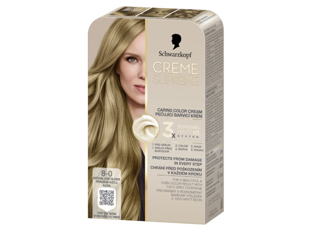 Schwarzkopf Creme Supreme - barva, kterou chcete, s péčí, kterou si zasloužíte. Tato barva na vlasy Schwarzkopf, která pečuje, obsahuje systém HaptiQ pro trojité posílení vazeb uvnitř vlasů, který vlasy připraví, chrání a posiluje pro krásnou a rovnoměrnou barvu s až 100% krytím šedin. Jak to funguje? Bonding pre-serum: Intenzivní pečující pre-serum se systémem Schwarzkopf Bonding HaptiQ dokonale připraví vlasy na barvení. Vytváří nové mikrovazby a vyhlazuje tenké oblasti, posiluje vlasy a umožňuje rovnoměrné a krásné barvení vlasů. Bonding barva na vlasy: Chrání vlasy před novým poškozením během barvení pro krásnou barvu. Bonding maska: Pokrývá vlasy ochrannou vrstvou a vytváří nové mikrovazby pro intenzivní péči o vlasy.
