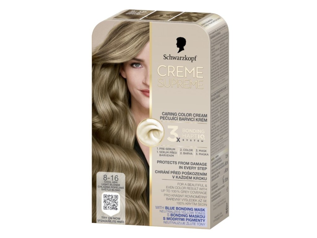 Schwarzkopf Creme Supreme - barva, kterou chcete, s péčí, kterou si zasloužíte. Tato barva na vlasy Schwarzkopf, která pečuje, obsahuje systém HaptiQ pro trojité posílení vazeb uvnitř vlasů, který vlasy připraví, chrání a posiluje pro krásnou a rovnoměrnou barvu s až 100% krytím šedin. Jak to funguje? Bonding pre-serum: Intenzivní pečující pre-serum se systémem Schwarzkopf Bonding HaptiQ dokonale připraví vlasy na barvení. Vytváří nové mikrovazby a vyhlazuje tenké oblasti, posiluje vlasy a umožňuje rovnoměrné a krásné barvení vlasů. Bonding barva na vlasy: Chrání vlasy před novým poškozením během barvení pro krásnou barvu. Bonding maska: Pokrývá vlasy ochrannou vrstvou a vytváří nové mikrovazby pro intenzivní péči o vlasy.
