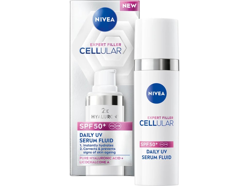 NIVEA Cellular denní UV sérum fluid SPF50+ je efektivním řešením pro každodenní ochranu pleti proti UV záření a redukci známek stárnutí pleti. Účinné složení obsahuje 2 typy čisté kyseliny hyaluronové (mikro a makro) pro podporu vlastní tvorby hyaluronu v pleti, vyhlazení a viditelnou redukci vrásek zevnitř a Licocalcone A, silný antioxidant bojující proti oxidačnímu stresu a vnějším negativním vlivům, který chrání pleť před předčasným stárnutím. Podpořte mladistvý vzhled vaší pleti se značkou NIVEA Cellular.