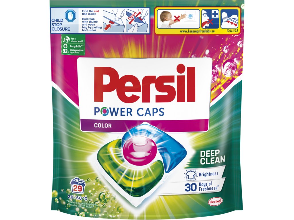 Persil Power Caps s technologií Color obsahuje unikátní kombinaci účinných látek, které bojují proti odolným skvrnám. Užijte si dokonalou čistotu a dlouhotrvající svěžest. Persil Power Caps jsou účinné při nízkých teplotách, dokonce i od 20 °C. Poskytuje zářivost, 30 dní svěžesti.
