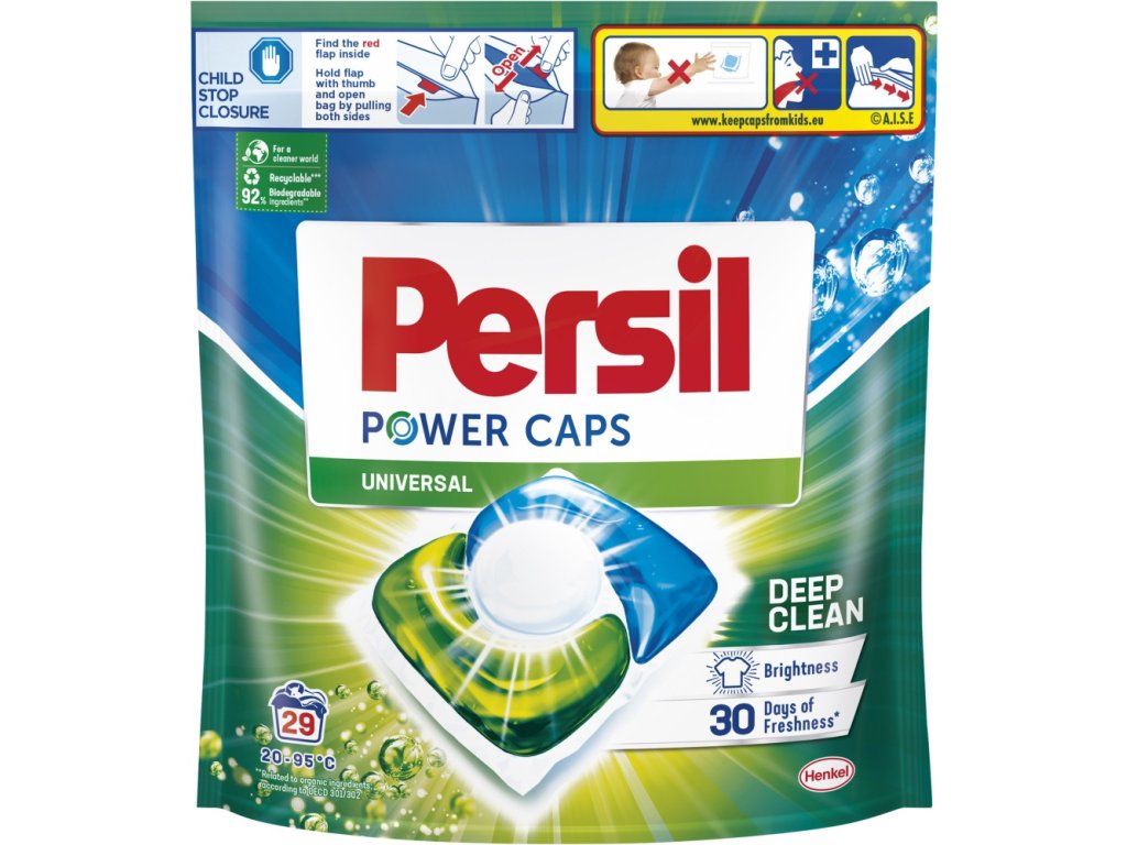 Kapsle na praní Persil Power Caps s technologií Deep Clean obsahují jedinečnou kombinaci aktivních složek, které působí proti odolným skvrnám. Prací prostředek proniká hluboko do vláken a odstraňuje i ty nejmenší molekuly špíny pro dokonalý výsledek a zářivě čisté oblečení. Dopřejte si dokonalou čistotu a dlouhotrvající svěžest Persil. Persil Power Caps jsou účinné i při praní na nízké teploty, už od 20 °C. Pro čistější svět jsou prací kapsle dodávány ve recyklovatelném obalu.