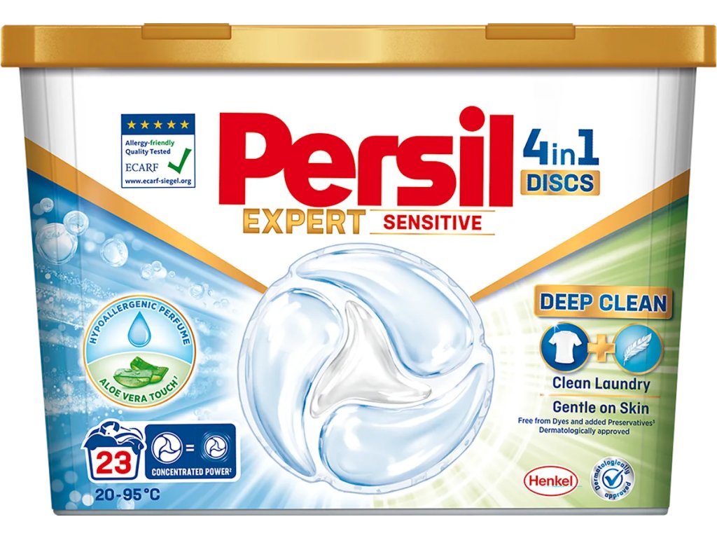 Persil prací kapsle Discs 4v1 Expert Sensitive jsou ideálním řešením pro citlivou pokožku. Nabízejí čtyři účinné funkce v jednom, a to odstraňují skvrny, rozjasňují barvy, chrání vlákna a zanechávají svěží vůni. Díky dermatologicky testovanému složení jsou šetrné i k jemné pokožce, což ocení zejména rodiny s dětmi. Persil Sensitive je skvělou volbou pro alergiky a osoby s citlivou kůží. Snadné dávkování kapslí šetří čas i energii při praní. Užijte si perfektní čistotu prádla a jemnou péči s Persil pracími kapslemi.