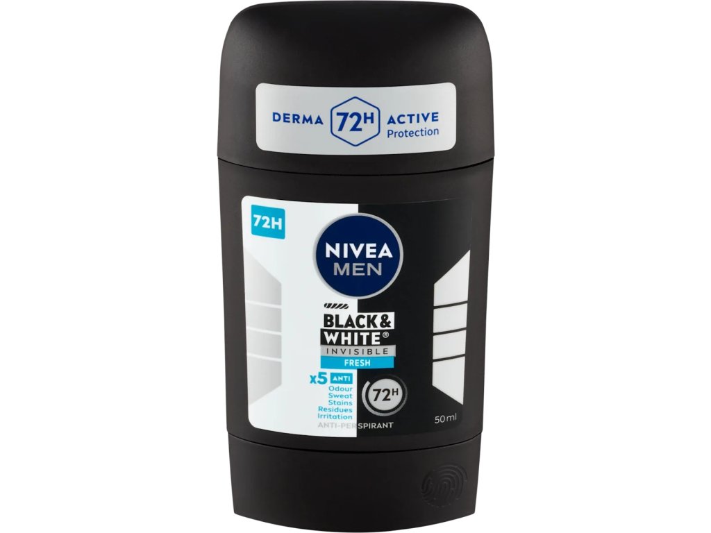 NIVEA MEN antiperspirant stick Black & White Invisible Fresh pro muže se svěží vůní zaručuje spolehlivou ochranu proti pocení, která trvá až 48 hodin. Navíc pomáhá velmi účinně působit proti vzniku žlutých skvrn od potu na bílém oblečení a bílých skvrn od antiperspirantu na černém oblečení.